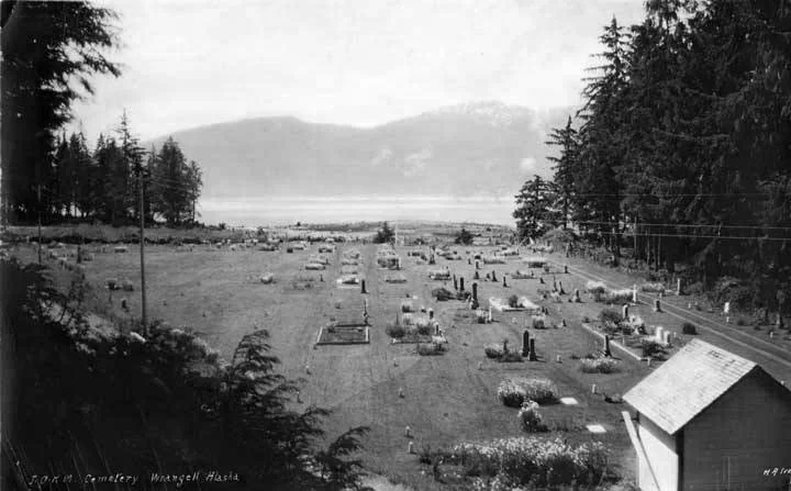 “With his request in mind, the loyal citizens of Wrangell, following his death, had the body brought from Sitka to Wrangell and it was interred with those of his old friends who had gone before; in a beautiful spot overlooking the meeting place of the bright blue waters of the Pacific with those of the turgid Stikine.
