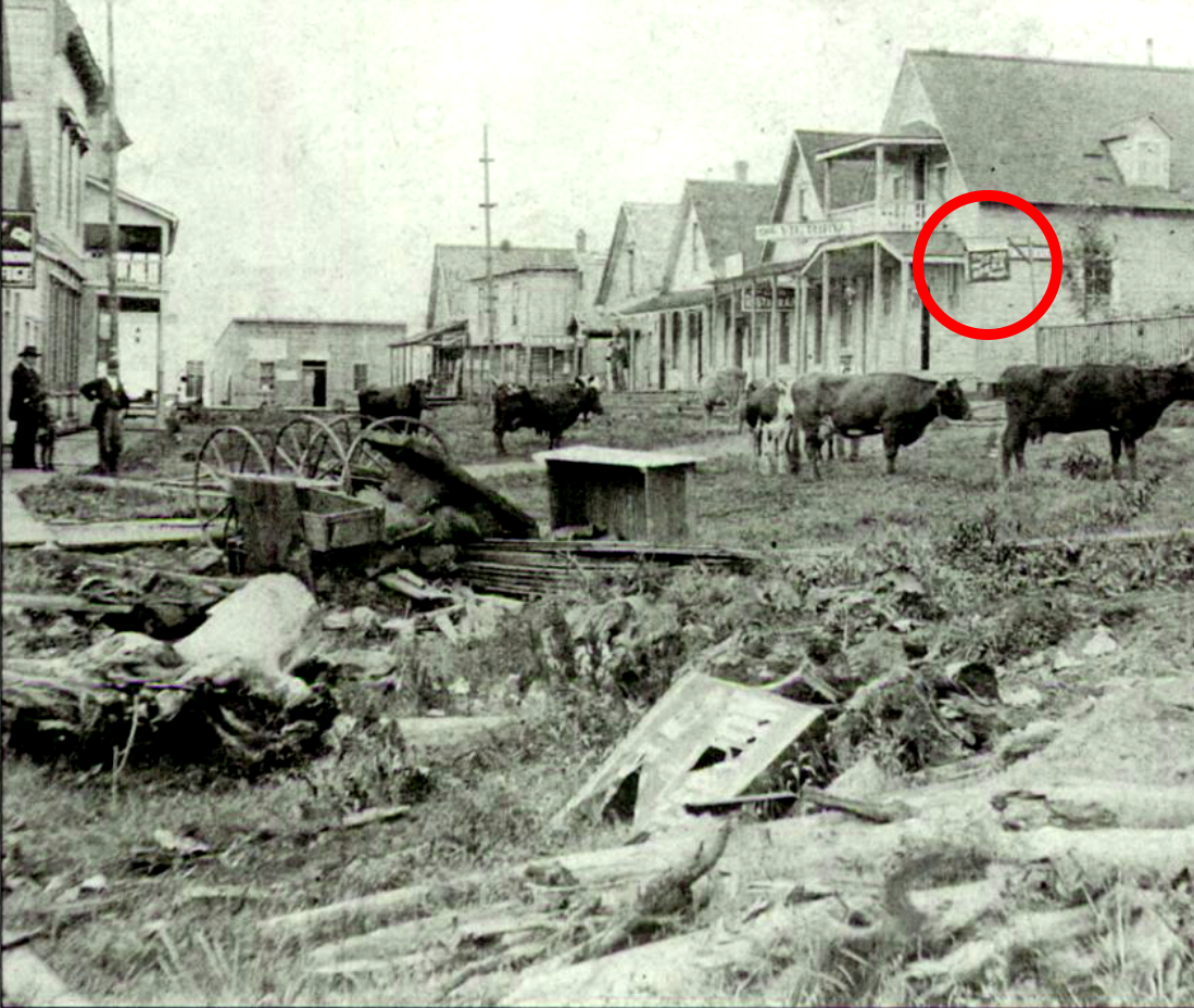 Cows graze and debris litters the walkway of what is today Wrangell’s Front Street. Circled in red is a sign pointing visitors to the direction of the Fort Wrangel Opera House. (photo credit: Wrangell Museum, via Images of America: Wrangell by Bonnie Demerjian).