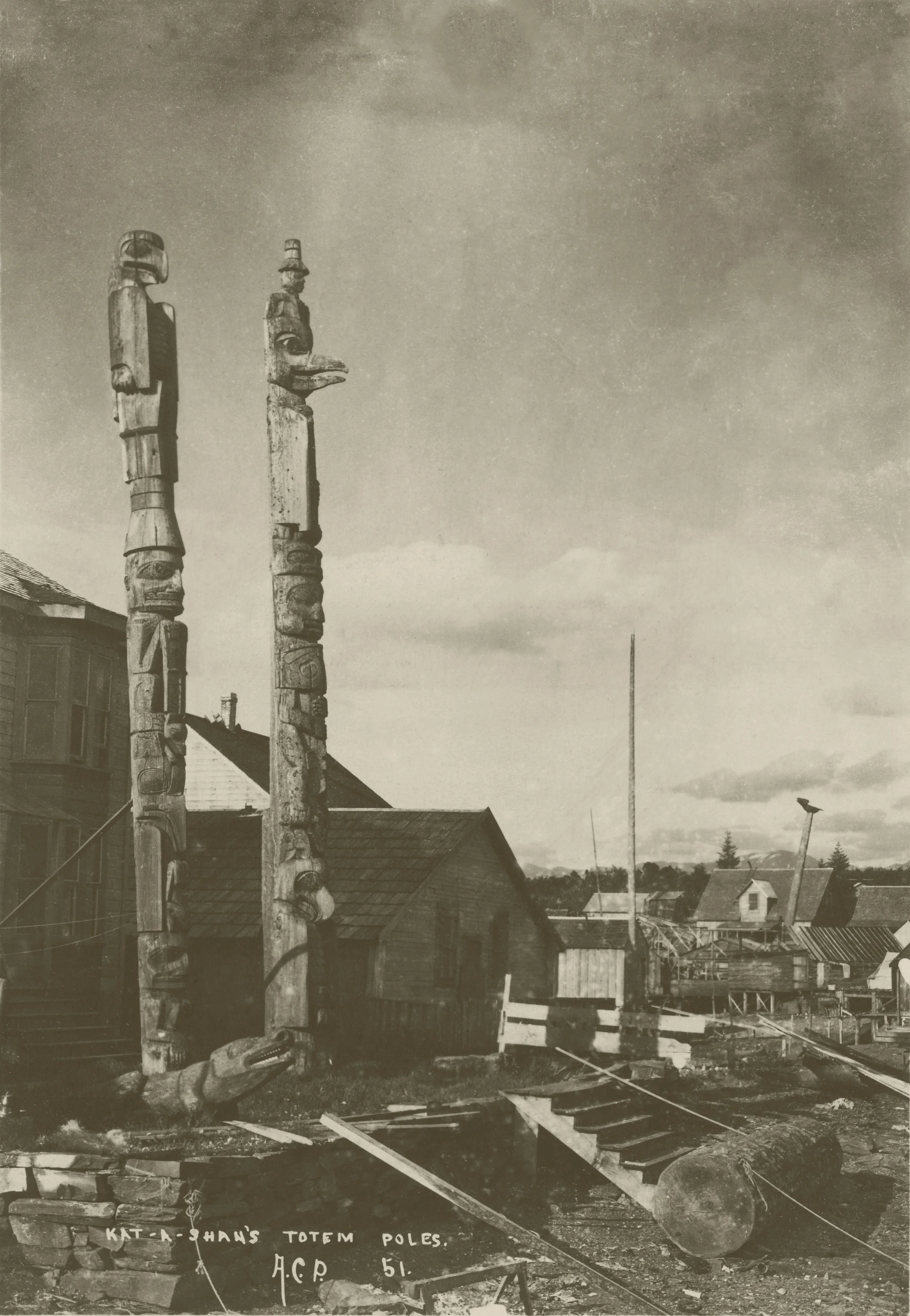 51. Kat-A-Shan’s Totem Poles. Kadashan’s home and totem poles were popular with visitors to Wrangell. Many photographers captured images of these poles, including Eadweard Muybridge in 1868 who shot a photo from a similar vantage point looking east. The Wolf Grave Totem sits near the base of the Kadashan totems, while the Flying Raven Totem is visible in the background. (Photo credit: Wikipedia Commons)