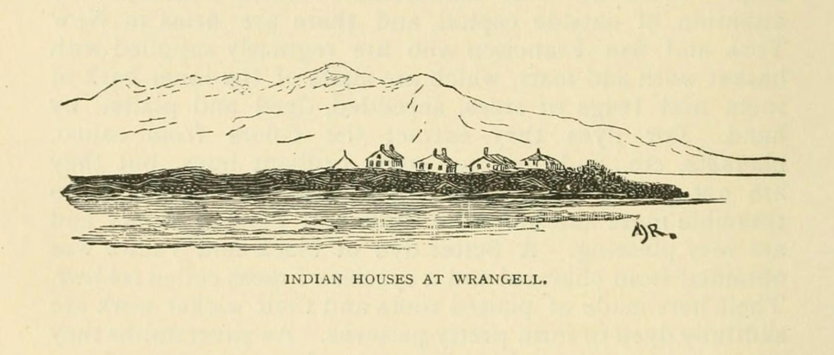 Indian Houses at Wrangell. Black-and-white illustration of Tlingit homes on Shustack Point, with Woronkofski Island in the background. (image credit: Our New Alaska by Charles Hallock, 1886. Free to use, public domain.)