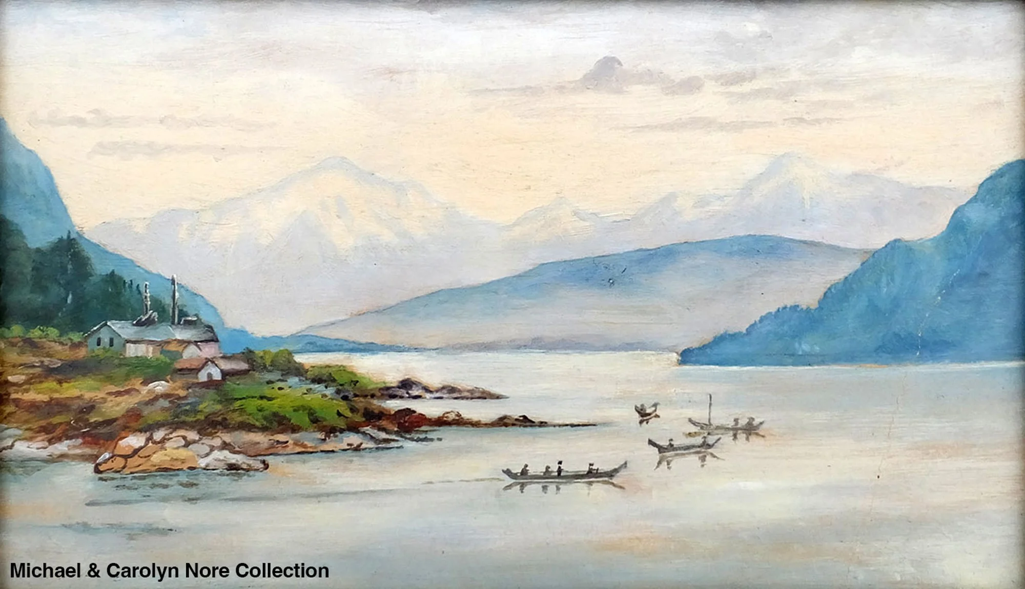 This painting depicts the homes and graves on Shustack Point, the peninsula which sticks out in front of Wrangell creating Etolin Harbor. In 1924, construction began on the Etolin Harbor Breakwater which would change the appearance of the point forever. (image credit: Theodore Richardson, Untitled, Coastal village, 1914. Anchorage Museum Collection, Gift of Len and Jo Braarud, 1989.014.011).