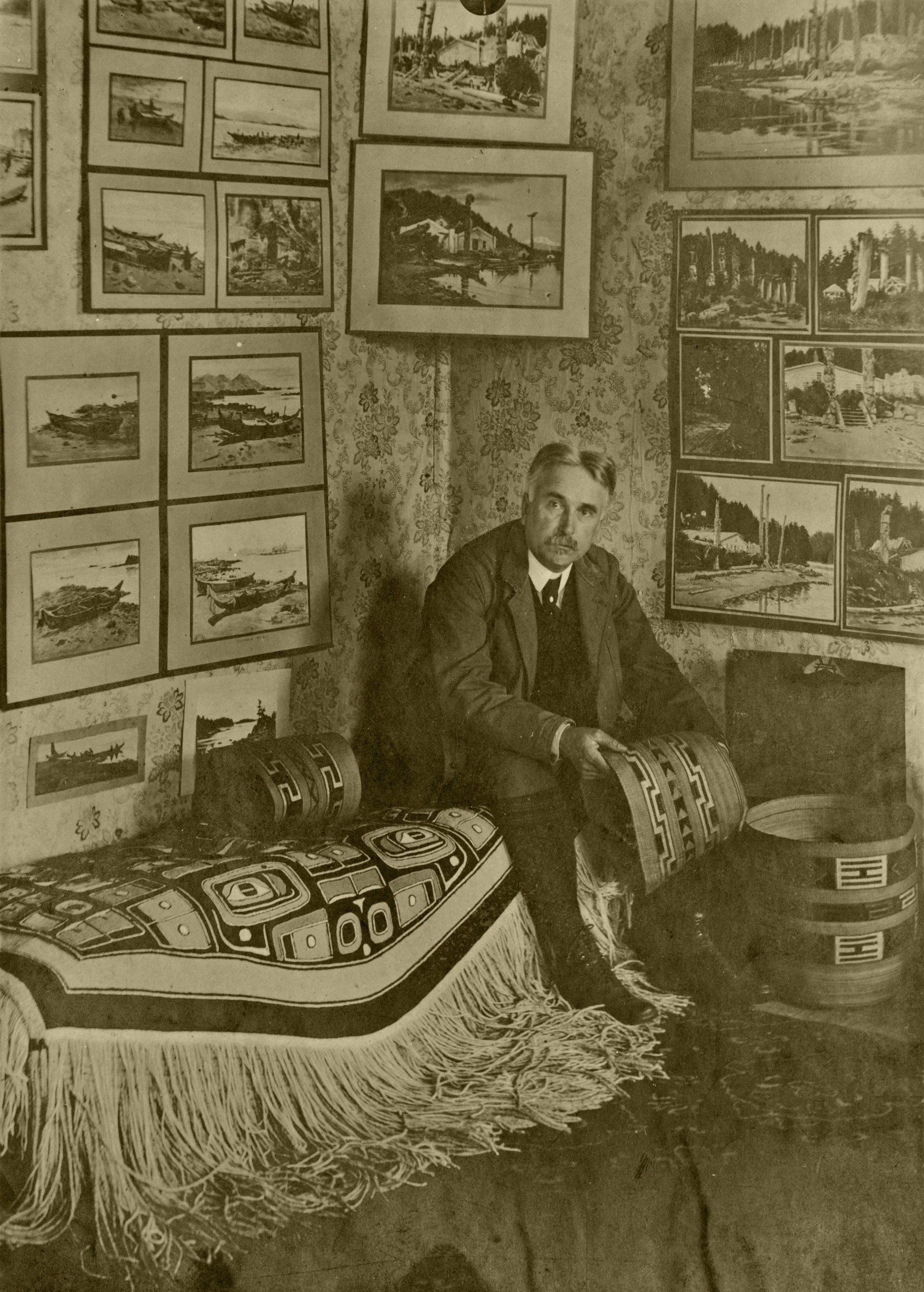 “His reproduction of the beautiful mountains, which in most cases are abrupt and striking, taken under many different circumstances of fog, evening haze and twilight, morning light, etc. are the admiration and delight of the beholder… Then there are the Indian huts and villages, the totem poles of the chiefs, and many surroundings of that far away land which are faithfully pictured in a masterly way.”