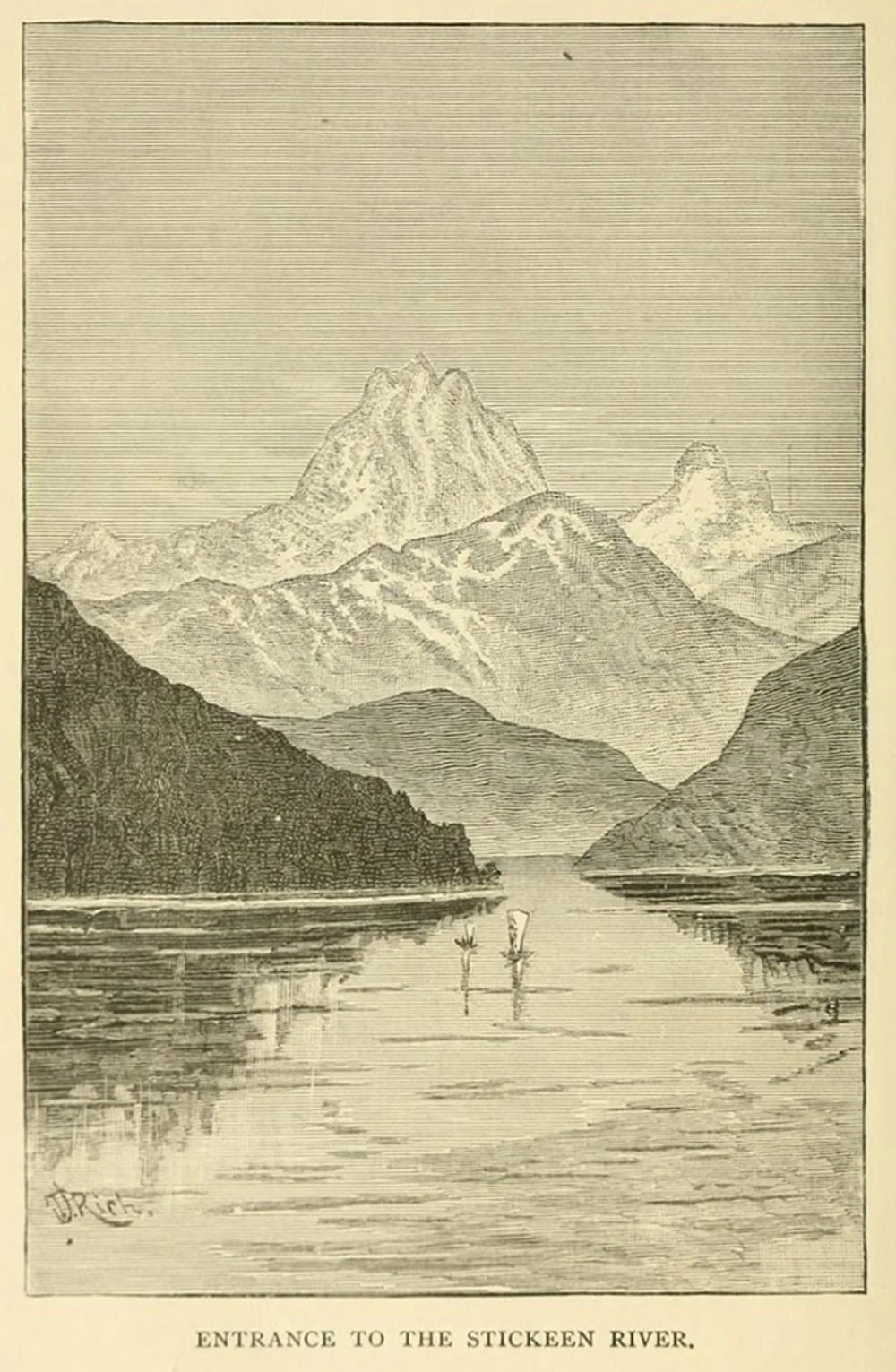 Entrance to the Stickeen River. A black-and-white illustration of islands parting to reveal the mouth of the Stikine River, with mountains in the distance. This image was selected to appear before the title page of Our New Alaska. (image credit: Our New Alaska by Charles Hallock, 1886. Free to use, public domain.)