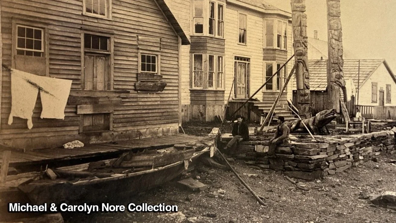 At some point around 1890, both grave totems were permanently moved to new spots. The Killer Whale Grave Totem went north to the Fort Wrangel courtyard, and the Wolf Grave Totem moved a short distance to the west, in front of the newly constructed home of Kadashan, an impressive modern-style 2-story home featuring two prominent totem poles bearing his name. (image credit: Michael & Carolyn Nore Collection)