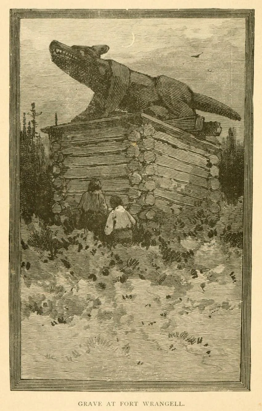 The first written account the Wolf Grave Totem may come from Eliza Scidmore’s 1883 visit to Alaska. He wrote in her book, "Over the graves of the dead, which are square log boxes or houses, they put full-length representations of the dead man’s totemic beast, or smooth poles finished at the top with the family crest. One old chief’s tomb at Fort Wrangel has a very realistic whale on its moss-grown roof, another a bear, and another an otter.” Scidmore may have mistaken the wolf for a bear. She published this illustration in her book, Alaska, Its Southern Coast and the Sitkan Archipelago. (image credit: Wikipedia Commons)