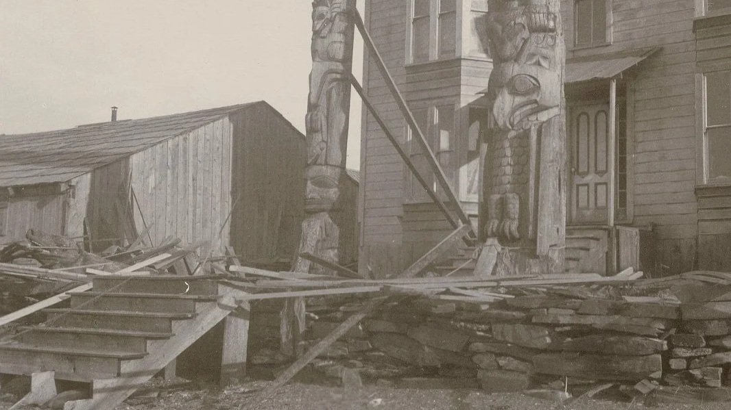 In 1898, photographer A.C. Pillsbury visited Fort Wrangel to capture the town amidst the Klondike Gold Rush. He took several photos of Kadashan’s home, including this one of two women sitting casually on the Wolf Grave Totem. (Photo credit: Ketchikan Museums)