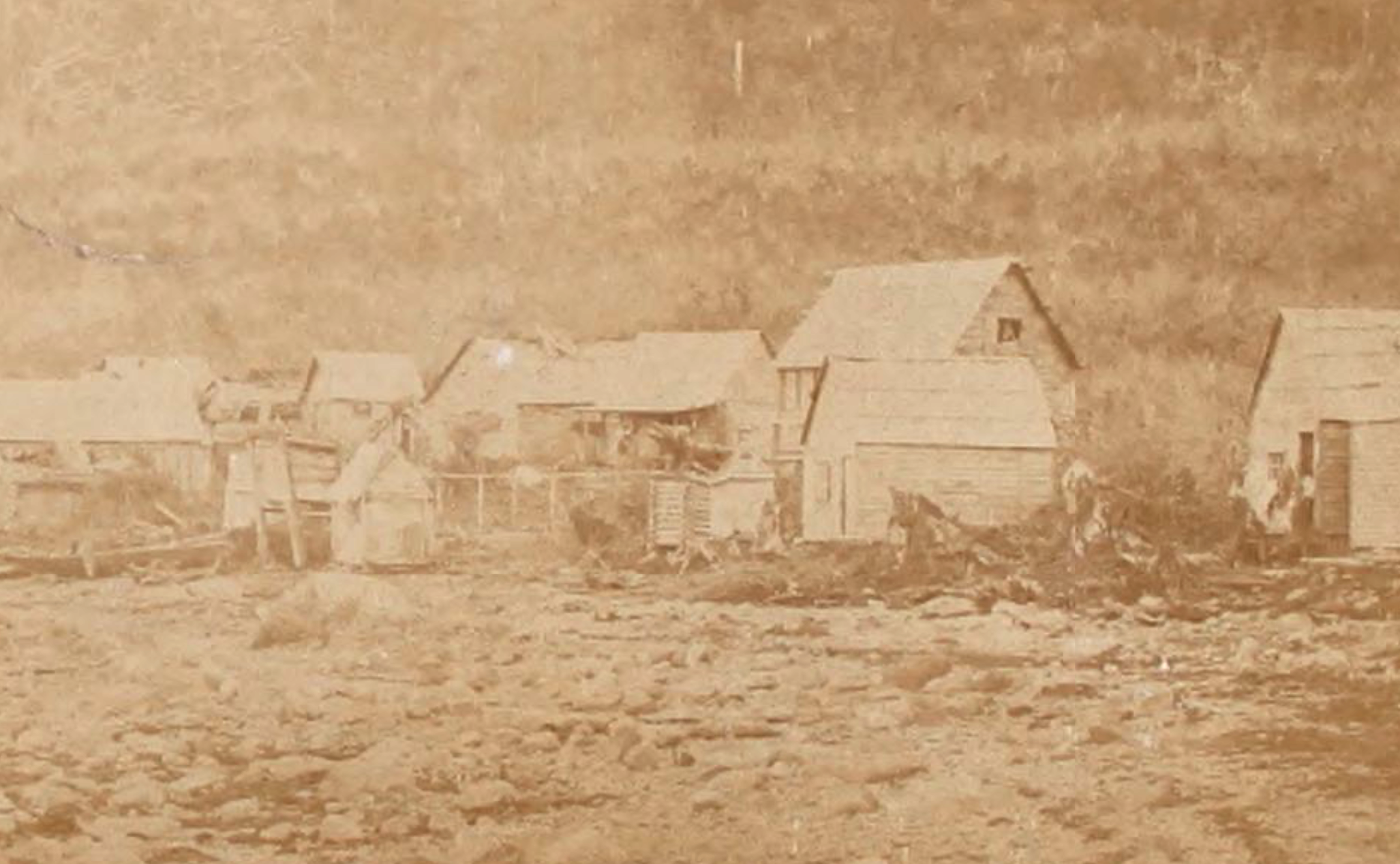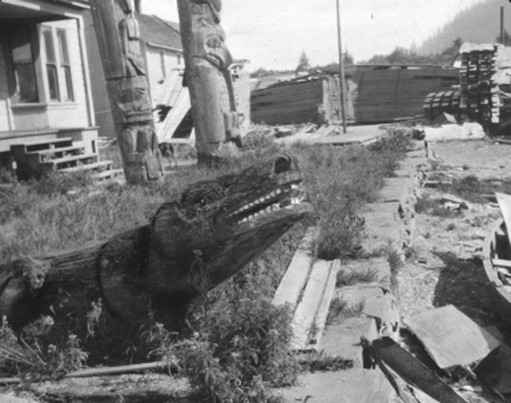 This undated photo may be one of the last images of the Wolf Grave Totem. By the 1920s, the sawmill operation expanded to completely surround Kadashan’s home with boards of timber. It created a risky situation, where one spark from Kadashan’s wood stove could ignite the unchecked towering stacks of lumber and sawdust surrounding his home.