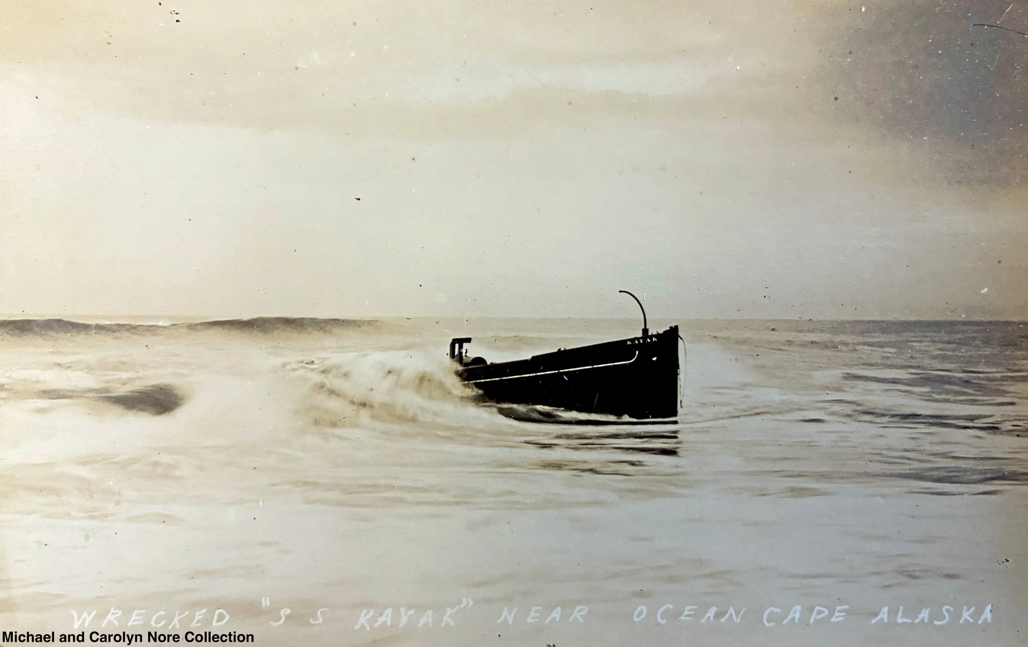 In 1913, just five years after the Star of Bengal sank, the Kayak ran into high seas outside Yakutat. The ship attempted to turn, hit rocks, and sank. The crew narrowly escaped aboard lifeboats. Said the Alaska Daily Empire: “The Kayak has a dark record. This boat had in tow the Star of Bengal when she was wrecked and 138 people perished. She has been a sort of trouble maker, it is said, ever since she took to the water and every seaman who ever shipped aboard her was glad when his time was out.” (photo credit: Michael and Carolyn Nore Collection)