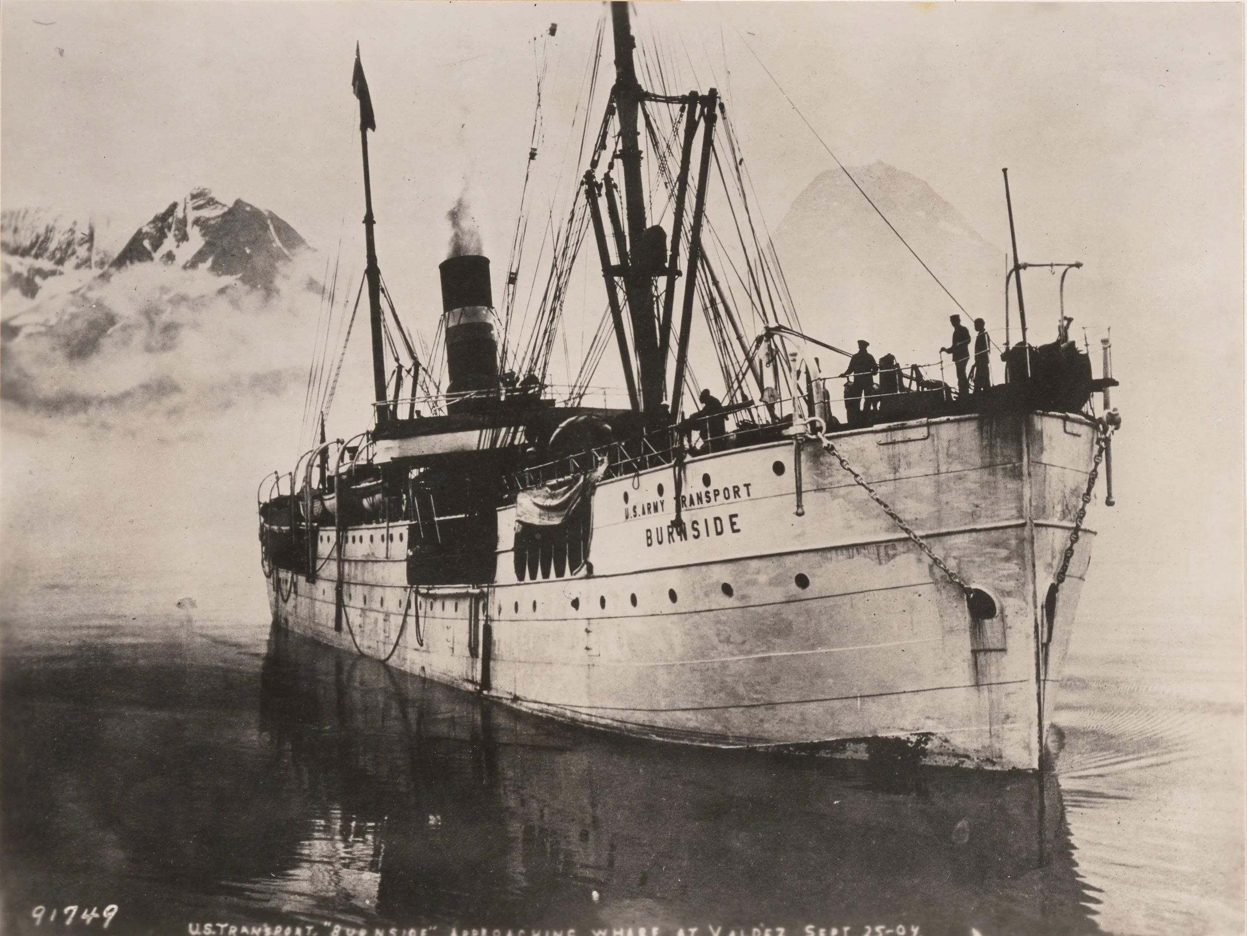 (262’ Length, 40’ Beam, 1,877 Tons) The USAT Burnside played an unexpected role in the wreck of the Star of Bengal story. On September 21, the Hattie Gage spotted the Burnside laying cable near the mouth of the Stikine River. The Hattie Gage detoured from returning to Wrangell to announce the wreck of the Star of Bengal in order to ask the Burnside for help. The quartermaster captain said the Burnside would need to send a telegram to Washington asking for permission. Even though the Burnside would have been too late to save anyone, this delay was roundly criticized in the aftermath of the wreck. This photograph was taken in Valdez, Alaska. (photo credit: Wikipedia Commons)