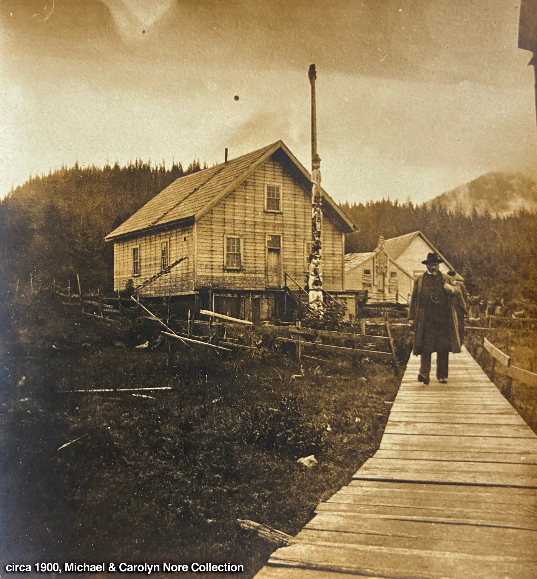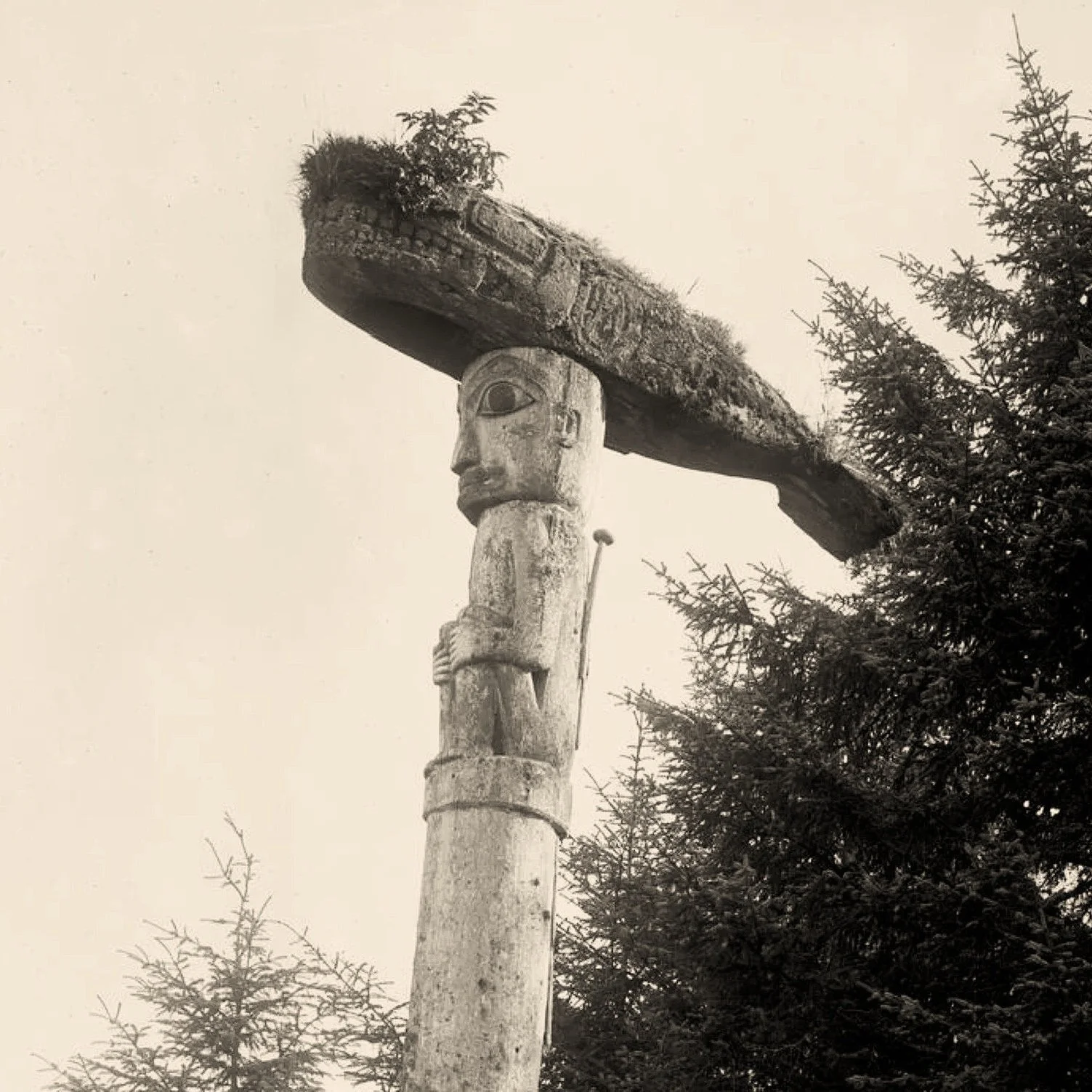 The Wolf Grave Totem began appearing in photographs in the 1880s next to the Killer Whale Grave Totem, until it was removed to the base of the two Kadashan poles around 1890.
