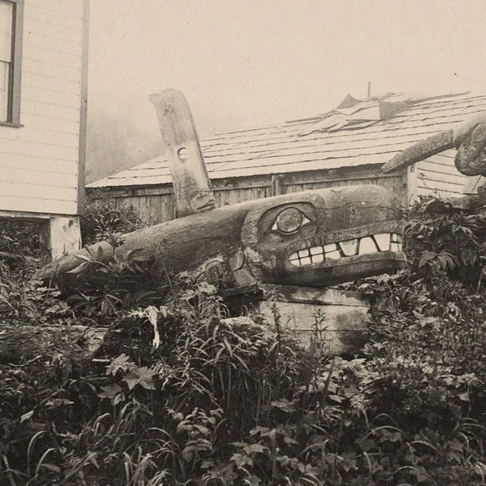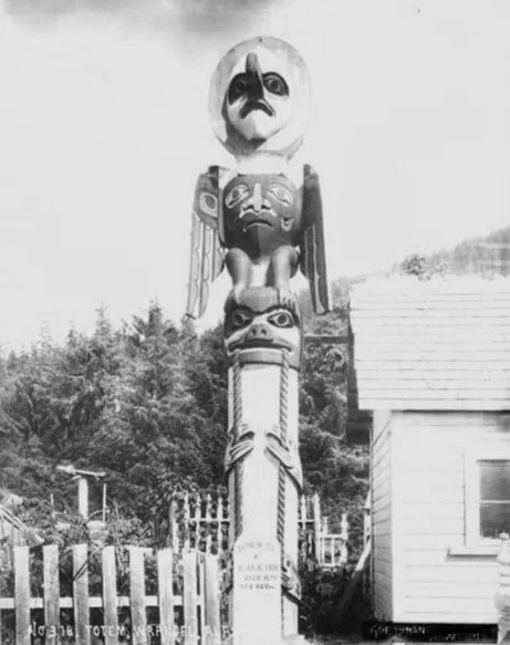 The Kadashan poles, named for Kaasx’agweidí leader Kadashan, were first photographed in 1868. By the 1920s, both poles were moved east as the Wrangell sawmill overtook their original area. Replicas were produced in 1940 by the CCC, and in 2025 a replica now stands in Totem Park.