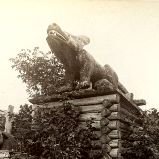 The Killer Whale Grave began at the north edge of Ḵaachx̱ana.áakʼw next to the Wolf Grave Totem in the 1880s until it was moved into the courtyard of Fort Wrangel, where a replica carving now stands.